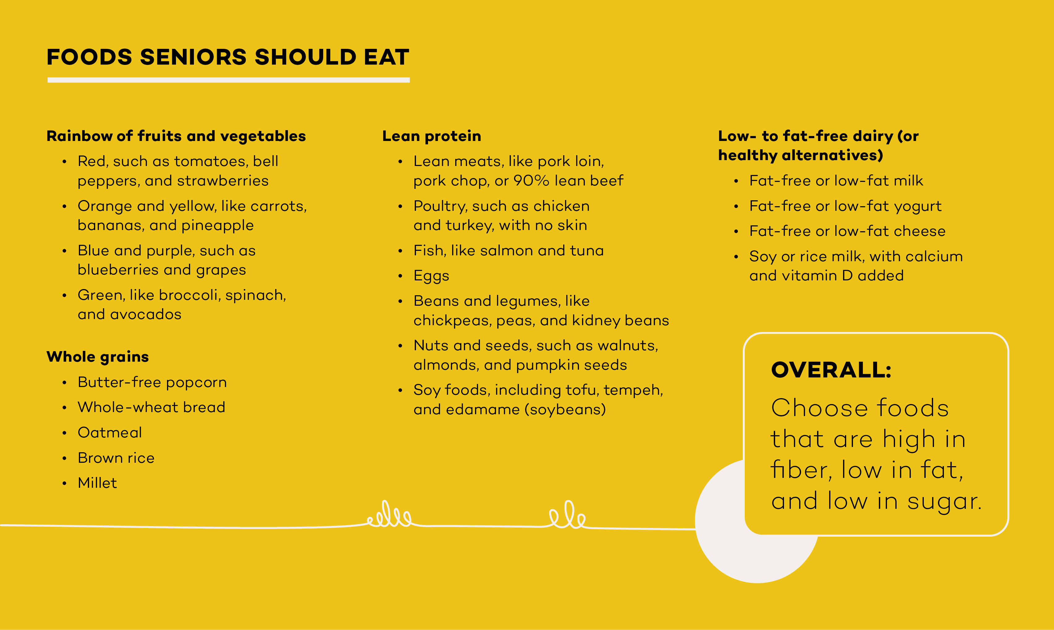 As you make healthier choices, reading nutrition labels should get easier and serve as a quick guide for making decisions. Remember that foods high in fiber, vitamin D, and calcium — and low in saturated fat, added sugar, and sodium — make the best foods for seniors.